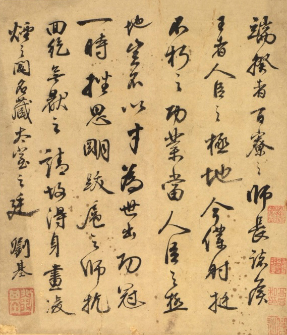 行書 明代高啟、近代鄧蒼梧鑒藏。1.高 (1336-1374),字季迪,號槎軒,長洲 (今江蘇省蘇州市)人。元末明初詩人、文 學家。與劉基、宋濂並稱“明初詩文三大 家”,又與楊基、張羽、徐賁被譽為“吳中四 傑”,著有詩《高太史大全集》十八卷等。 2.此作為澳門著名收藏家鄧蒼梧(1900- 1990)先生舊藏。鄧氏室名「傳硯樓」「傳 研樓」,二十世紀六、七十年代活躍於澳門 古玩界。曾于澳門新馬路經營「永大絲網 行」,後創立「永大古董書畫金石文玩」, 收藏重點集中於明清至近代海派、京津畫派 作品。 |